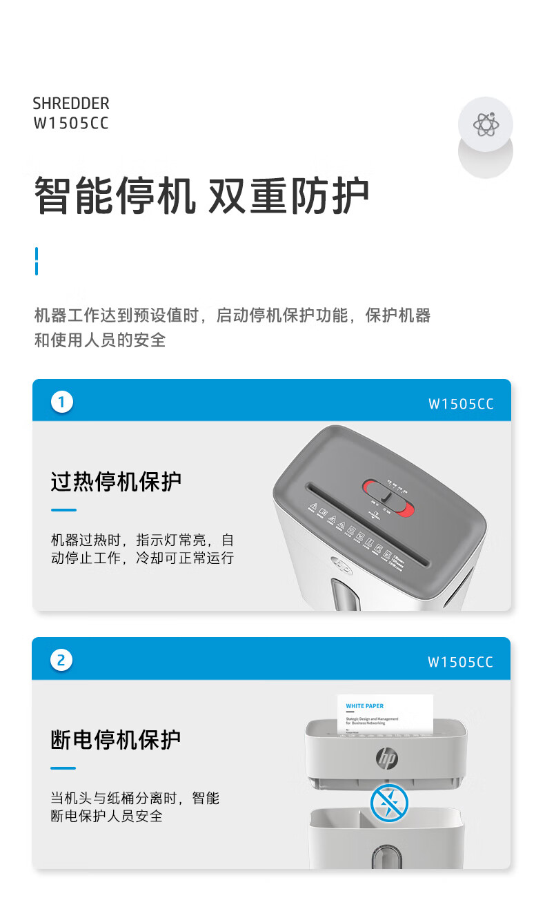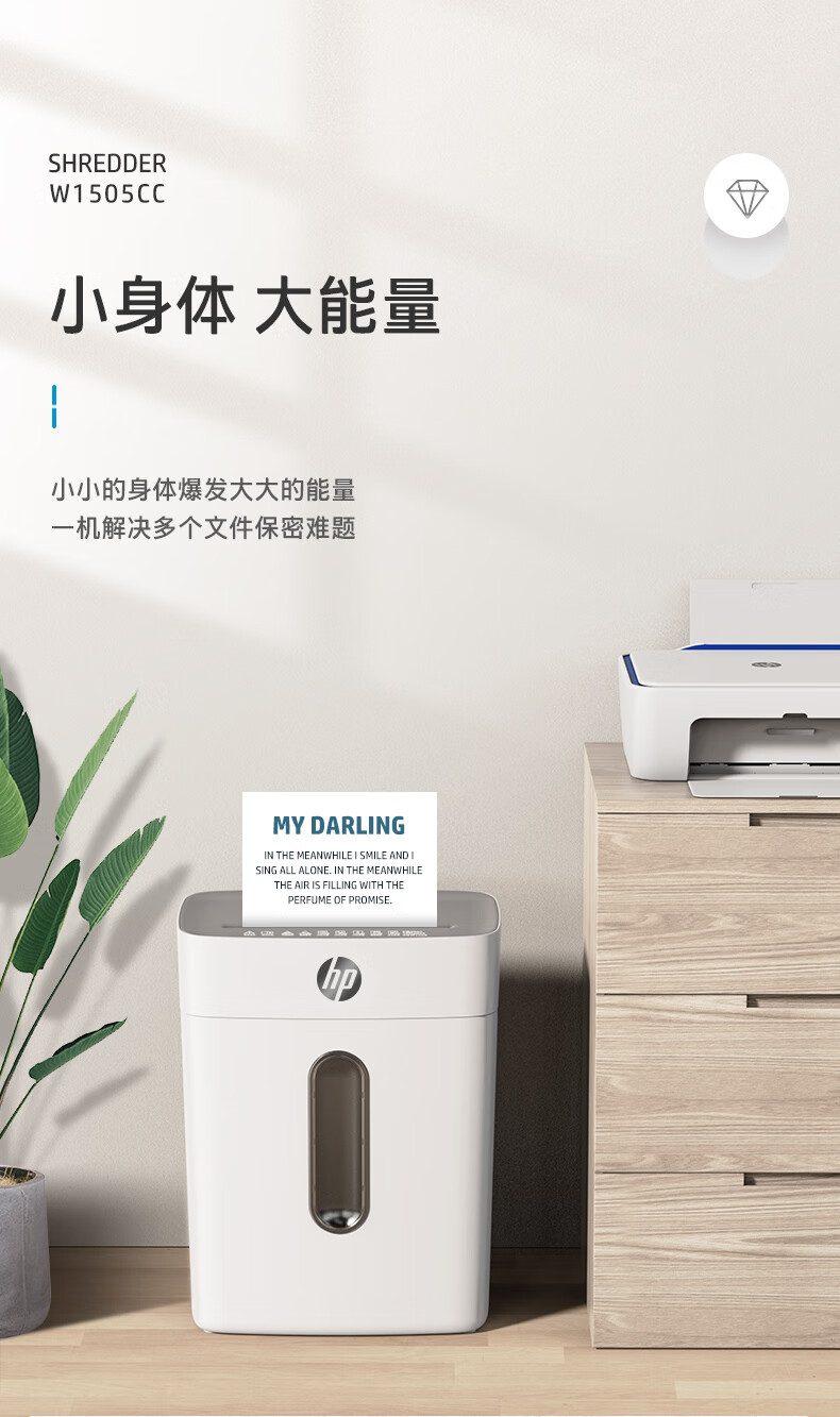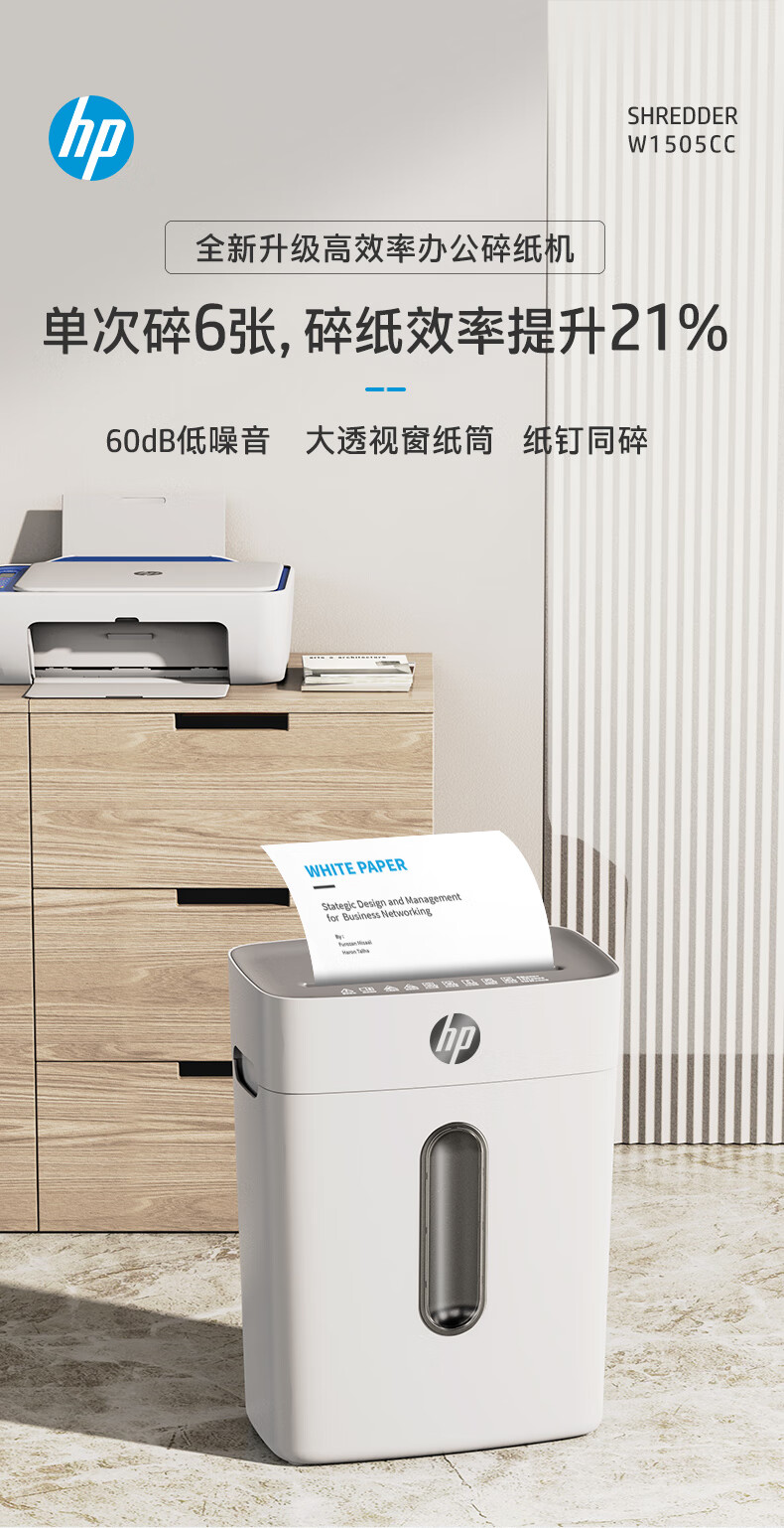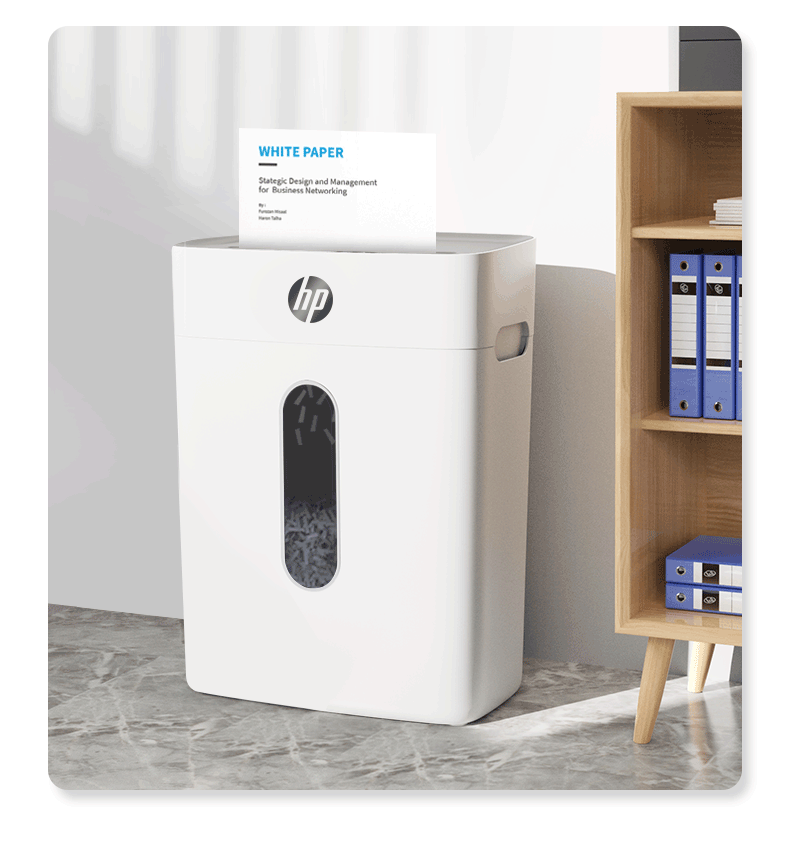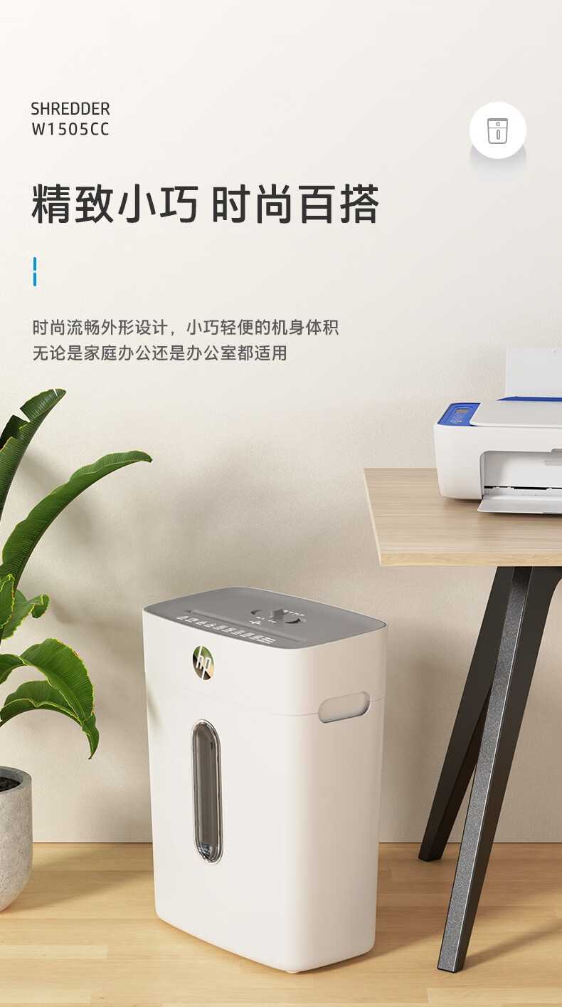 首页 >> 惠普(HP)4级保密办公家用碎纸机文件粉碎机 (单次6张 连续碎5分钟 15L 可碎卡碎订书针 智能光感)W1505CC