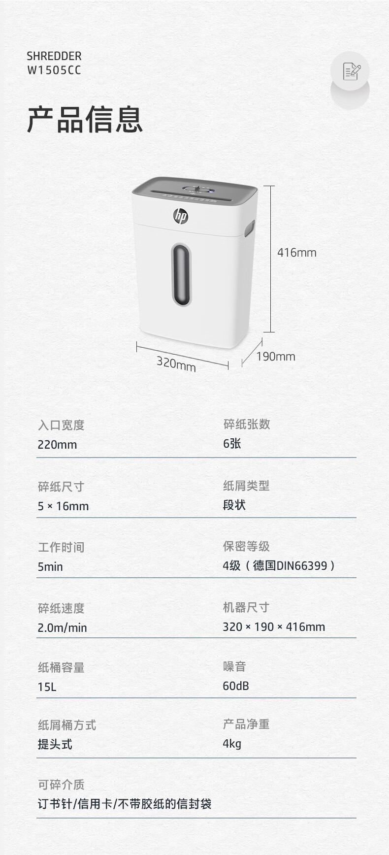 惠普(HP)4级保密办公家用碎纸机文件粉碎机 (单次6张 连续碎5分钟 15L 可碎卡碎订书针 智能光感)W1505CC